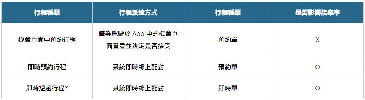 *即時短趟行程:當駕駛接受派遣提早上線,並在前往預約行程的上車地點途中,仍有可能收到系統配對的即時短趟行程。該短趟行程係由系統預估足夠讓您完成接送後,仍來得及準時抵達預約行程上車地點,以有效運用時間。